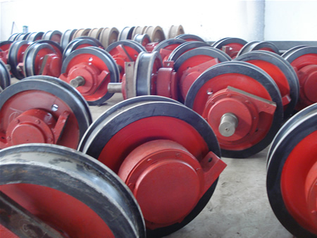 起重機車輪組的組成材料一般是優質的鑄鋼,因為車輪一般的損壞方式是磨損,點蝕和硬化層壓碎,所以為了增加車輪表面的耐磨度和使用壽命,一般使用比較堅硬和淬火深度比較大的材料。更多資訊盡在http://m.whjkjd.com/news/57.html
